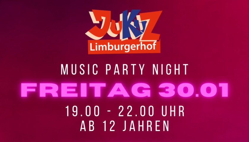Party im JUZ – Freitag 30.01 19.00 – 22.00 Uhr Am Freitag, den 30.Januar, laden wir euch von 19 -22 Uhr zu einer kleinen, feinen Party im Juz ein. Für