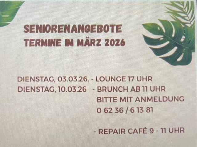 Liebe Senioren*innen, folgende Termine finden im März statt: Dienstag, 03.03.26 Seniorenlounge ab 17 Uhr Dienstag, 10.03.26. Brunch ab 11 Uhr (Anmeldung: 0 62 36 / 61381) Repair Café von 9